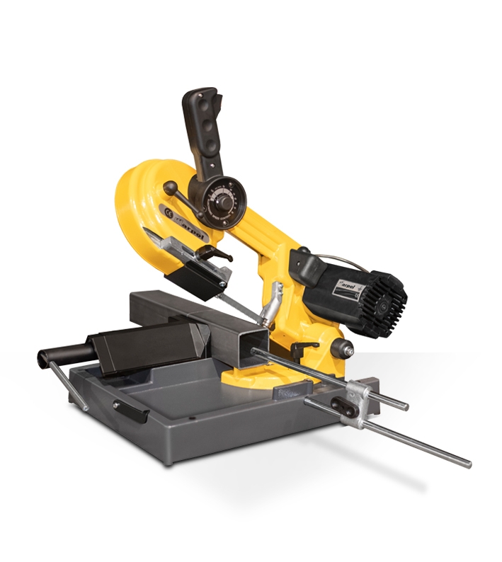 Sega a nastro portatile. Progettata, realizzata e protetta per il taglio mediante sega a nastro, di materiali metallici di ogni natura fino ad un diametro o spessore massimi di 150 mm.