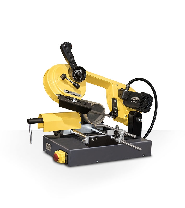 Sega a nastro stazionaria con taglio verticale e orizzontale destro e sinistro, per il taglio a secco di materiali metallici e non, su piano di appoggio, con la testa in posizione verticale fissa, oppure in morsa, con la testa basculante, azionata manualmente (diametro max 150 mm).
